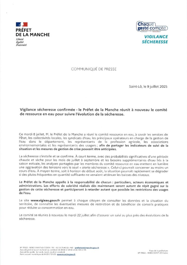 Le Préfet de la Manche réunit à nouveau le Comité de ressource en eau pour suivre l’évolution de la sécheresse. Lire le communiqué de presse ci-dessous.
